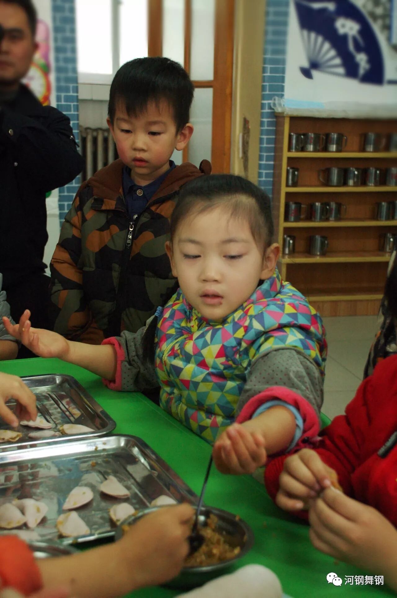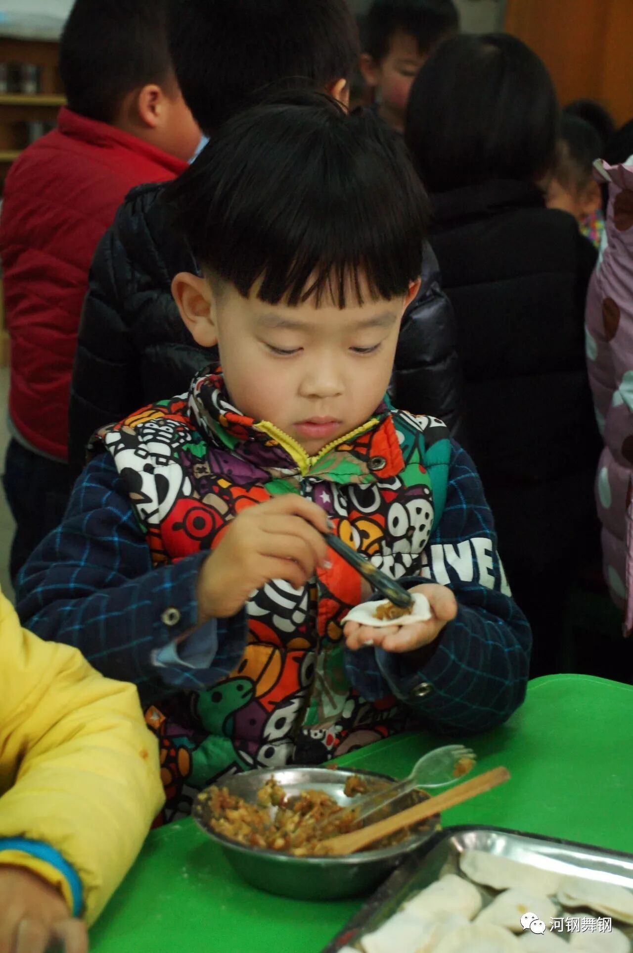 孩子们在家长和老师的教导下,认真地学习着如何包饺子,可高兴了。