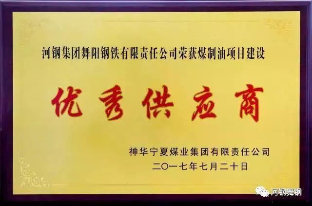 2017年7月20日,在习近平总书记视察神华宁煤集团煤制油项目一周年之际,神华宁煤集团隆重召开神华宁煤集团煤制油项目建设总结表彰暨消缺改造百日会战动员大会。河钢舞钢作为唯一一家钢铁企业受到神华宁煤集团邀请参加大会,会上,被神华宁煤集团评为煤制油项目建设“优秀供应商”。消息传来,河钢舞钢全体干部职工倍感自豪、倍受鼓舞,决心创造出更大的业绩献礼国家重点项目。